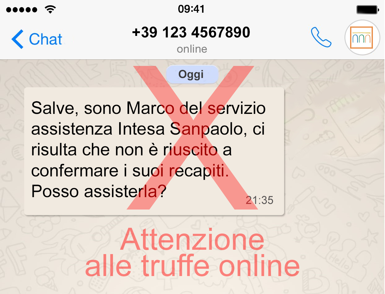 Per aiutarti a proteggerti dalle frodi, ricorda che il Gruppo Intesa Sanpaolo non ti contatta mai via WhatsApp, così come non ti chiede via email o SMS i codici che usi per accedere alla banca online, le tue informazioni personali o finanziarie.